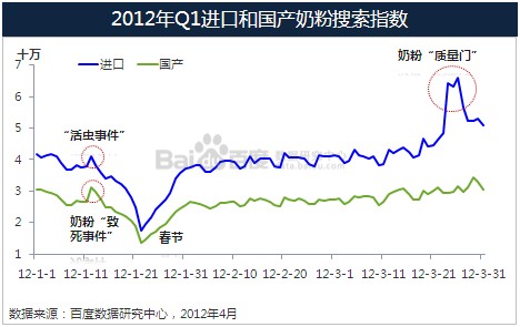 2012年Q1进口和国产奶粉日均搜索指数分别为40万和27万,1月份奶粉安全事件带动指数上涨;3月份某进口奶粉“质量门”使得进口奶粉指数剧烈上升。