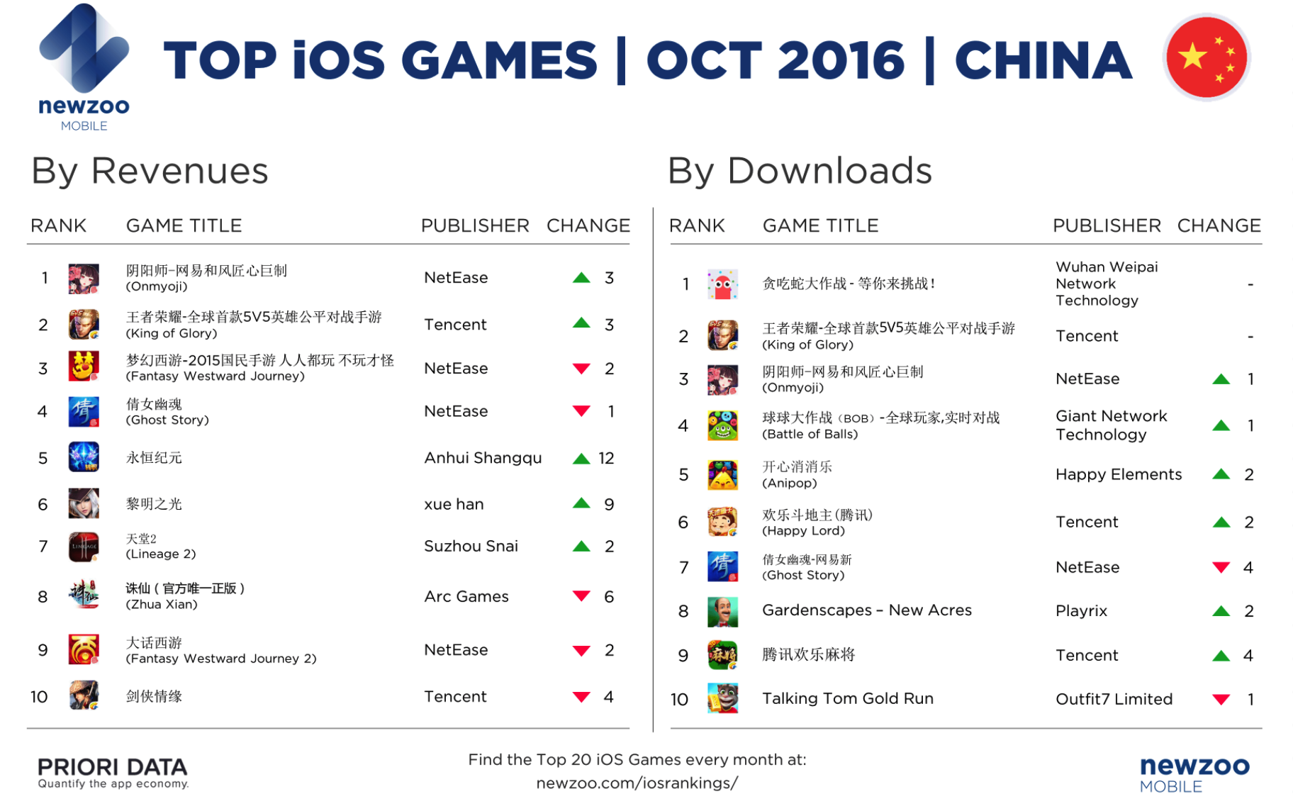 网易在中国市场继续着他的强劲表现,新 RPG 游戏阴阳师九月份刚刚发布,就成为十月份涨势最猛的游戏,从收入榜第 3 名跃居首位。排名第 2 的是腾讯的王者荣耀,九月份榜首的梦幻西游则下降至第 3。