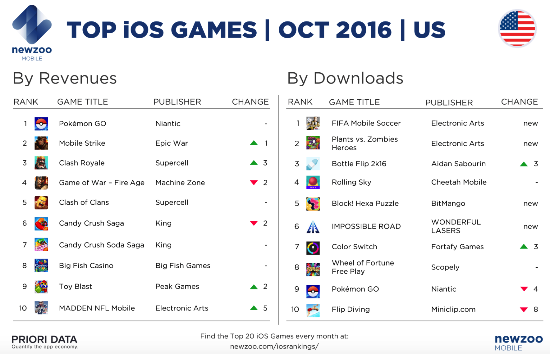 对于EA来说,十月收获颇丰。EA旗下的《疯狂橄榄球》收入排名上升5个名次后进入榜单,是收入TOP10的产品中唯一一款体育题材的游戏。《FIFA Mobile Soccer》是热门主机游戏FIFA系列的移动版,拿下美国市场iOS下载榜冠军说明其在移动端的受欢迎程度不一般。此外,《植物大战僵尸:英雄》也拿下了美国下载第2的成绩。