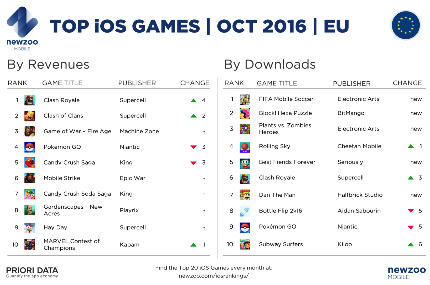 实际上,Supercell 和 EA 两个公司应该是十月份欧洲区的赢家。Supercell 利用 Pokémon GO 排名下降空出的榜单位置,以及皇室战争收入榜排名第 1 的带动作用,将旗下的 Clash of Clans(部落冲突)推至收入榜第 2,相较之前的排名上升了 2 名。