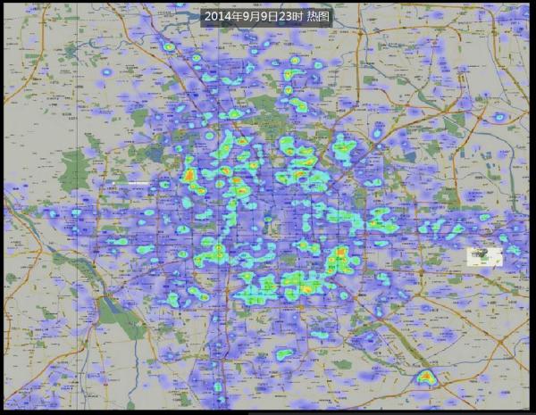 下图为夜间23点的人口分布(即居住分布)。可以发现,居住中心主要集中在中关村、回龙观、西小口、六道口、五道口、牡丹园、清河、知春路、大钟寺、学院南路、劲松-潘家园、宋家庄-石榴庄、京沪高速与南六环相交处、十里堡、望京、北苑、立水桥、天通苑、芍药居、小营等地。