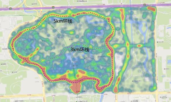 其实设计者也无法准确预测到这些现实使用情况,这不禁让人思考,是否 3 km 的规划环道以及仰山所在中心区域的设施配套不足,导致使用率低? 5 km 环道,是否因塑胶跑道而吸引了大部分人群;而仰山所在中心区域因灯光昏暗,且较少道路连通园门口,所以人群较少?这可能是设计师的精心安排,但有些可能是疏忽。在规划实施评估和未来的规划改进中,可以针对性地进行优化。这是利用大数据发掘微观尺度空间使用模式的例子。