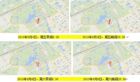 如下图所示,对比工作日周五和周末周六的人流量,可以发现,周五的人流量主要集中在外围 5 km 的环道,周六的人群分布则更为广泛,更加深入到奥森公园内部的各处景点。同时对比早间和晚间的人流量,周五早上8:30的人流量要明显高于夜晚20:30,而在周六早上和夜晚的人流量差异较小。