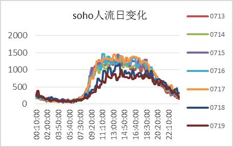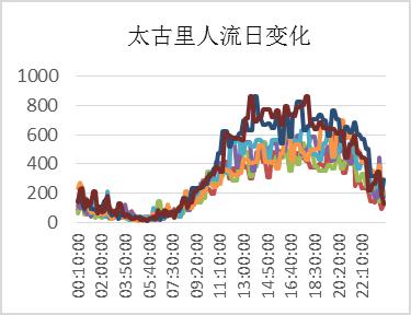 在太古里,周末人流量大于工作日;而日间人流量随时间推移缓慢增多,午间13:00左右增至最高峰,晚间22点之后,人群逐渐散尽。所以,太古里是人们休闲娱乐的去处,夜幕降临后大家各回各家。而在 SOHO,与太古里相反,工作日人流量大于周末;SOHO 达到人流量高峰的时间段,也比太古里提前,在早间10:00左右攀至最高峰,这正是上班族们陆续到达单位打卡开始一天工作的时间段。