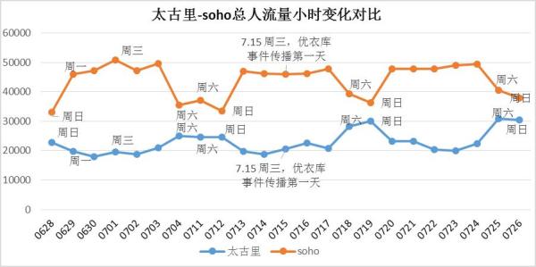 但实情和观感一致吗?暂把7月14日优衣库事件对人流的影响放在一边,通过图表(数据来自腾讯宜出行平台和百度景区热力图,人口数值经技术处理,不完全代表人数),我们可以发现,无论工作日还是周末,三里屯 SOHO 人流量均高于太古里人流量。当然,您可以在图里清楚读到太古里在事件后收获的人流增量。