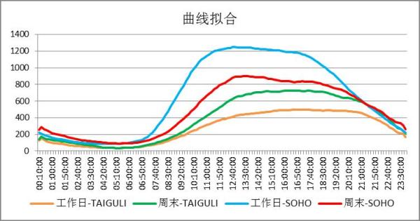 人流日变化图(上图)看起来像一团缠在一起的毛线。我们又做出工作日和周末的人流量拟合曲线(下图),可以更加直观清晰地对比太古里和 SOHO 的人流变化。