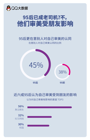 QQ大数据推出的《95后审美观》报告,更真实地还原95后的真实想法,他们自信却也在意别人的看法、有购买力而又不失品味、有个性不从众……相信随着95后逐渐步入社会,成为社会消费群体中重要的一群人,他们的审美观将越来越明显地影响未来产品的设计及市场发展趋势。