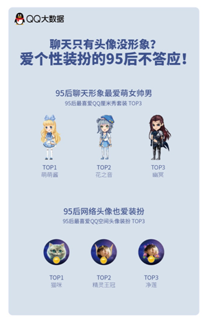 作为网络原住民的95后,其审美特点也体现在了互联网形象的个性化需求上,数据得出,在QQ空间使用装扮功能的用户中95后占六成。他们热衷于花时间和心思打扮自己的聊天形象,并和朋友们相互比较。16岁的安笙表示“聊天只有对话条会很无趣,那是父母辈玩的,他和同学们之间几乎每天都玩QQ厘米秀,可以装扮又可以做高校的表情和动作。”他们就连QQ空间的头像也会认真装扮一番。95后对于“好玩”、“个性化”与生俱来的追求,直到现在,QQ空间依然是年轻用户最活跃的社交阵地。