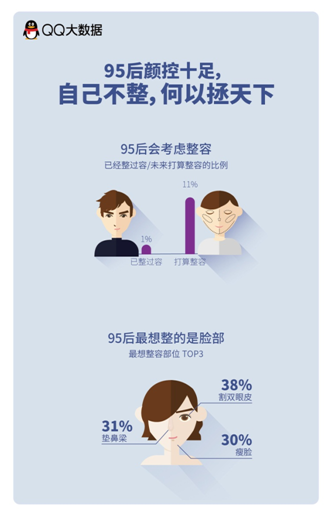 作为更加勇于接受新鲜事物的新兴力量,95后对于整容的接受度相当高,据《95后审美观报告》显示,能接受整容的95后高达85%,并有11%的95后未来打算整容,但近八成受访的95后都认为过度整容的产物“网红脸”并不是主流审美。