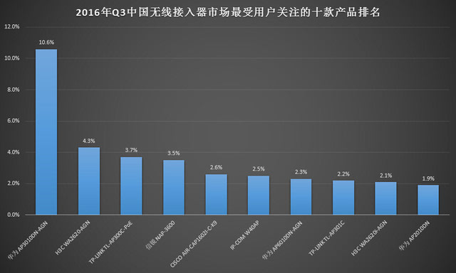在2016年第三季度最受欢迎的无线AP产品中,华为AP3010DN-AGN独占鳌头,以10.6%的比例高居第一名,并且从2015年开始这款产品就保持第一名的位置,可见市场反响非常不错。前十名的产品中,共有三款华为的产品入围,华为已经隐隐成为无线AP市场的巨头。第二名为H3C的WA2620-AGN,品牌关注比例为4.3%,与第一名有着不小的差距。,3C的无线AP产品也有两款进入到了前十名。其他产品的关注比例都没有超过4%,但他们之间的差距都很小。值得注意的是,这十款产品中有8款是国产产品,思科和IP-COM各自仅有一款入围。
