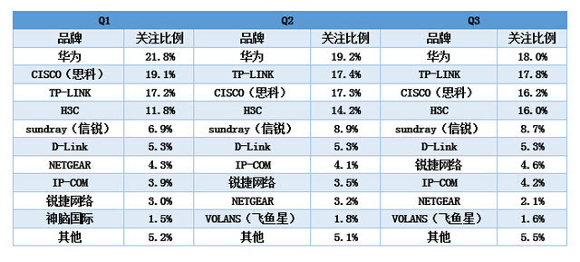 从每个季度的品牌关注比例来看,华为虽然一直排名第一,但是每个季度的关注比例都略有下降,不过下降不多。思科从第一季度的第二名,在第二和第三季度都被TP-LINK力压,排名第三。H3C的关注比例持续上涨,从第一季度的11.8%,上涨到第三季度的16%,稳稳排名第四。信锐和D-Link也牢牢占据着第五名和第六名的位置,没有变化。我们可以看到,国产品牌的关注比例持续向上,国产品牌的产品质量和技术也在不断提高,越来越受到用的关注。