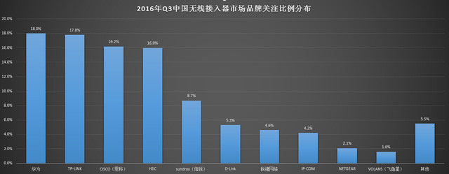 2016年Q3中国无线接入器市场品牌关注比例前十名分布