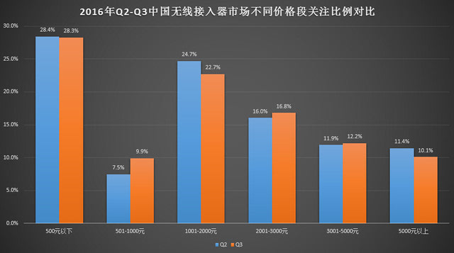 2016年Q2-Q3中国无线接入器市场价格区间关注比例