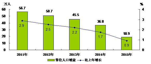 “十二五”时期,全市人口增速、增量“双下降”,常住人口年均增长 2.0%,比“十一五”时期低 3个百分点;累计增加 208.6万人,增量比“十一五”时期减少 215.3万人。常住人口增速呈放缓态势,常住人口增量逐年减少。
