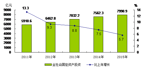 图 7 2011-2015年全社会固定资产投资及增长速度