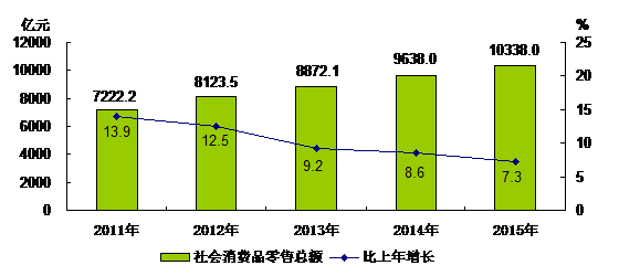 图 8 2011-2015年社会消费品零售总额及增长速度
