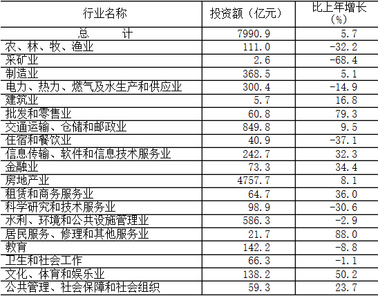 分产业看,第一产业投资 111亿元,下降 32.2%;第二产业投资 677.1亿元,下降 5.5%;第三产业投资 7202.8亿元,增长 7.8%。
