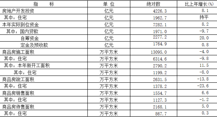 房地产开发:全年完成房地产开发投资 4226.3亿元,比上年增长 8.1%。其中,住宅投资 1962.7亿元,与上年持平;写字楼投资 906.6亿元,增长 20.8%;商业、非公益用房及其他投资 1357亿元,增长 13.2%。