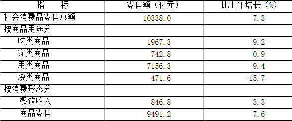 全年实现市场消费总额 18646亿元,比上年增长 8.7%。其中,实现服务性消费额 8308亿元,增长 10.5%;实现社会消费品零售总额 10338亿元,增长 7.3%。限额以上批发和零售企业中,汽车类实现零售额 1751亿元,下降 4.7%;通讯器材类实现零售额 1217.4亿元,增长 31.1%;中西药品类实现零售额 843.8亿元,增长 5.6%;文化办公用品类实现零售额 582.8亿元,增长 10.4%;家用电器和音像器材类实现零售额 432.9亿元,增长 15.6%。限额以上批发和零售企业实现网上零售额 2016.9亿元,增长 40.2%。