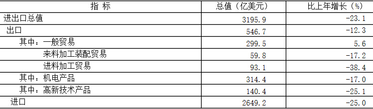 对外经济 :全年北京地区进出口总值 3195.9亿美元,比上年下降 23.1%。其中,出口 546.7亿美元,下降 12.3%;进口 2649.2亿美元,下降 25.0%。