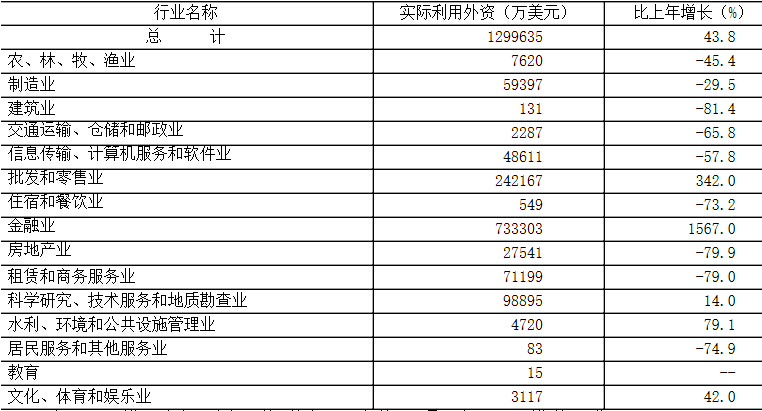 全年合同外资 323.8亿美元,比上年下降 9.3%。实际利用外资 130亿美元,增长 43.8%。其中,金融业占 56.4%,批发和零售业占 18.6%,科学研究、技术服务和地质勘查业占 7.6%,租赁和商务服务业占 5.5%,制造业占 4.6%,信息传输、计算机服务和软件业占 3.7%。