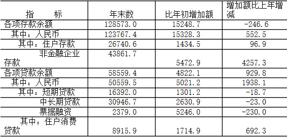 存贷款:年末全市金融机构(含外资)本外币存款余额 128573亿元,比年初增加 15248.7亿元,增加额比上年少 246.6亿元。年末全市金融机构(含外资)本外币贷款余额 58559.4亿元,比年初增加 4822.1亿元,增加额比上年多 929.8亿元。