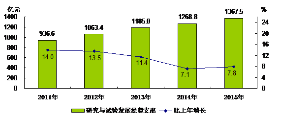 图 12 2011-2015年研究与试验发展经费支出及增长速度