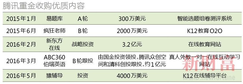 近年来,腾讯在泛娱乐版图的投资绝对突出,以游戏、影视为主的泛娱乐产业从本质看与教育同属内容产业。腾讯对内容的驾驭运营能力已经在影视游戏领域获得多次验证,从某种角度来讲,可以说强势社交与优质内容的有机结合造就了今天神一般的腾讯。因此,腾讯对教育内容的投入同样不遗余力,重金投入K12教育领域,先与教育巨头新东方达成战略合作,共建新东方在线,再收购强势垂直平台猿辅导,直接与百度作业帮竞争,未来教育有望成为其既游戏之后又一大现金牛业务。