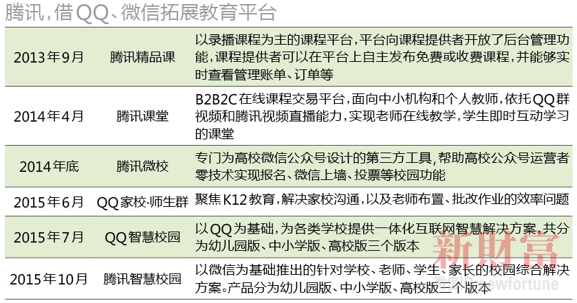 2013年9月,腾讯发布了以录播课程为主的课程平台腾讯精品课,平台向课程提供者开放了后台管理功能,课程提供者可以在平台上自主发布免费或收费课程,并能够实时查看管理账单、订单等。2014年4月,腾讯上线腾讯课堂,作为一个B2B2C在线课程交易平台,面向中小机构和个人教师,依托QQ群视频和腾讯视频直播能力,实现老师在线教学、学生即时互动学习的课堂。2014年底上线的腾讯微校,则是一款专门为高校微信公众号设计的第三方工具,帮助高校公众号运营者零技术实现报名、微信上墙、投票等校园功能。