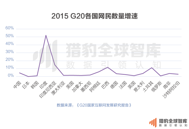 在互联网网民的增长潜力上,印度的后劲似乎更足。据《G20国家互联网发展研究报告》的数据,2015年印度网民增速高达51.9%,成为G20成员国网民增速最快的国家。而中国面临人口红利渐失的客观局面,网民增速出现瓶颈。