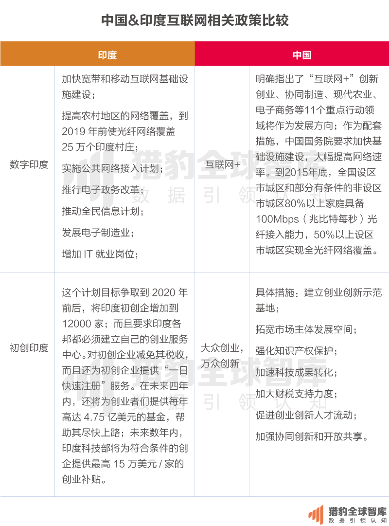 在发展互联网和鼓励创新创业方面,中国政府和印度政府都下了不少功夫 。中国总理李克强在2015年3月的政府工作报告上同时提出了“互联网+”行动计划和“大众创业,万众创新”的号召;同年,印度总理莫迪提出了多项新政,以鼓励互联网及创业企业发展,如“数字印度”(Digital India)、“初创印度”(Start-up India)、“技术印度”(SkillIndia)、“创新基金”(IndiaInnovation Fund)。从目标和具体措施上看,中国和印度的这些政策相近,都从资金、税收等方面对互联网发展进行了大力的扶持。