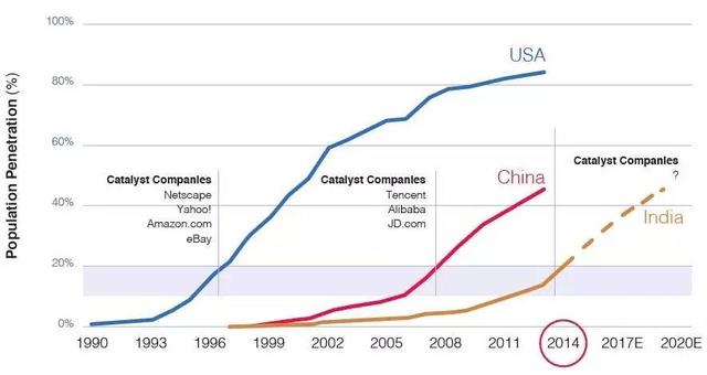 在诞生互联网“独角兽”企业方面,有“互联网女皇”之称的玛丽·米克尔在《2015年互联网趋势报告》中做出了这样的预测:2014年,印度的互联网渗透率仅相当于中国2008年的水平,以及美国1996年的水平。美国在1990到1996间产生了Netscape、Yahoo、Amazon、eBay等互联网巨头,中国在1999年到2008年互联网高速发展期间产生了腾讯、阿里巴巴、京东等巨头,如果印度以同样的模式获得增长,那么未来5年内将会得到巨大的发展,将有可能是下一批世界级互联网巨头的诞生地。