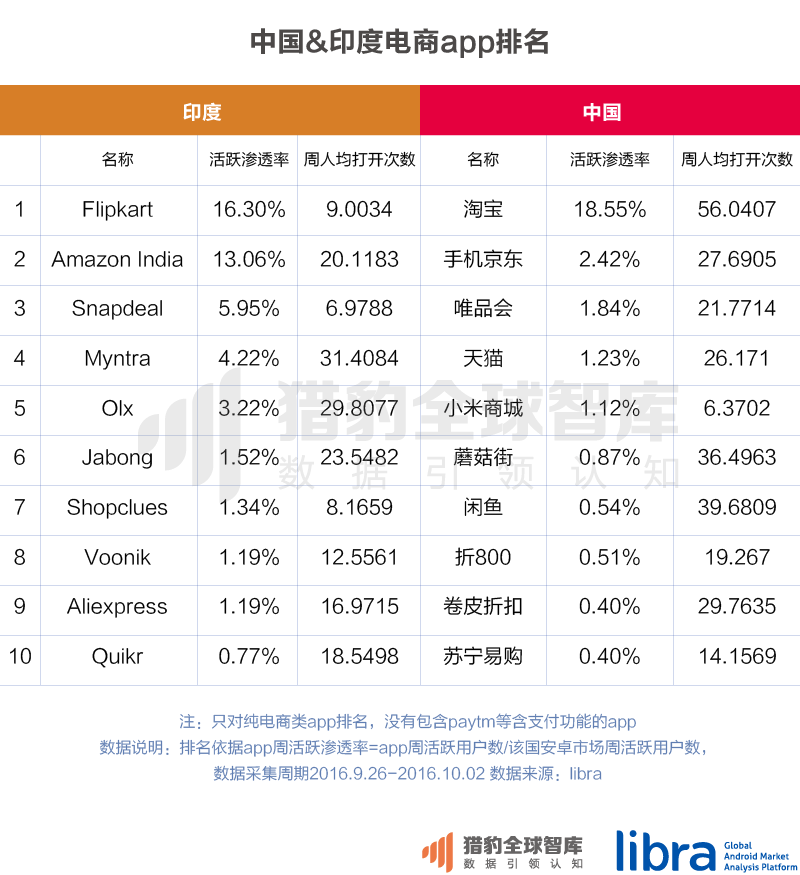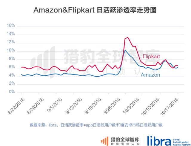 从猎豹移动数据平台libra的数据也能看出来,在排灯节期间,Amazon和Flipkart的日活跃渗透率都有大幅的上涨,截止到10月23日,两者的日活跃用户已经接近一样。