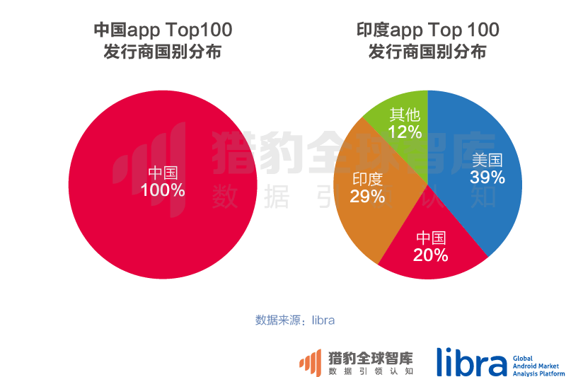 从猎豹移动大数据平台libra的数据可以看出,印度的移动app市场大部分由外国发行商统治,这里又以美国和中国的发行商为主,在印度app Top 100中,只有29个是印度本土的app发行商发行的。从这个比例可以看出,美国和中国的发行商都将印度作为海外的掘金之地。未来,印度移动市场将成为一个比中国还要竞争激烈的红海。