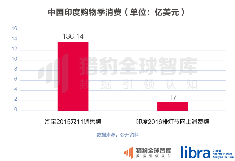 2015年中国“双11”购物节,仅淘宝一家的销售额就达到了912.17亿人民币(约合136.14美元),而RedSeerConsulting的数据,今年排灯节期间印度人在电商上的消费是17亿美元,中国人仅仅一天在淘宝上的消费就是印度整个排灯节电商消费的8倍。