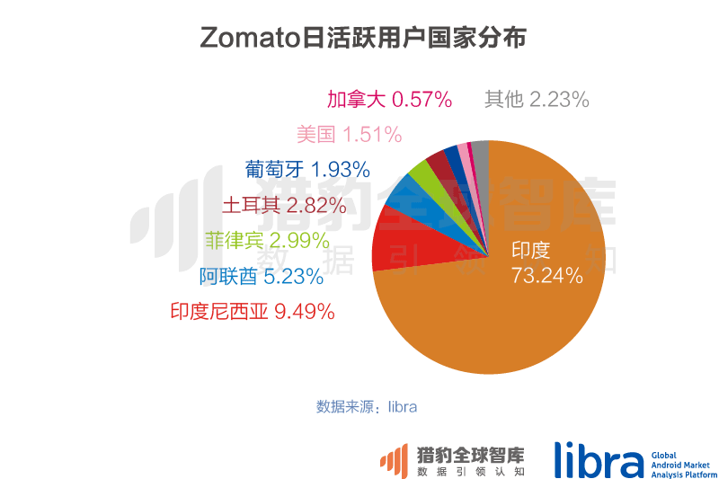 但在这方面,印度的企业似乎比中国企业更有国际化野心。印度的外卖老大Zomato 2010年底开始在印度市场发力,2012年就走出印度国门2013年将业务拓展至中东、非洲、南亚和南美;2014年在欧洲进行收购,业务拓展至19个国家;2015年初完成对美国市场第二的Urbanspoon的收购,业务拓展至22个国家,并成为Yelp的直接竞争对手。而从libra的数据也可以看出来,印尼已经成为Zomato在海外的第一大市场,在美国这样的发达市场也有一定的用户基础。而也许是中国市场刚刚稳定,中国外卖领域的三个巨头还没有向国际拓展的计划。