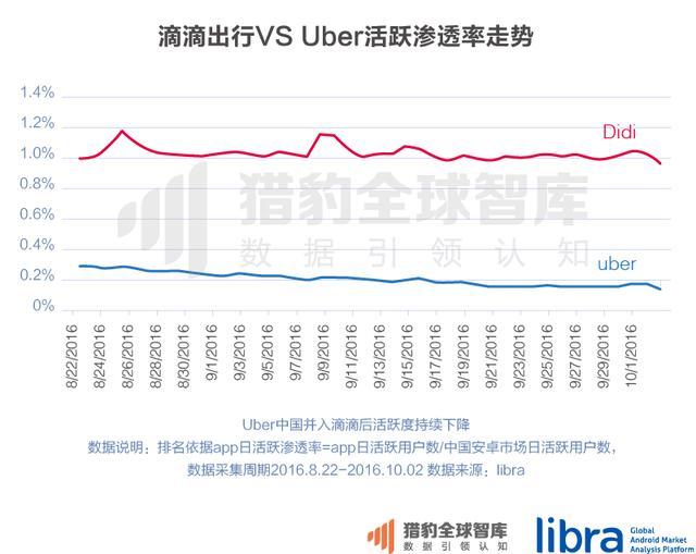 在中国,随着2016年8月,Uber中国宣布并入滴滴出行,打车领域的竞争似乎也已尘埃落定,Uber的活跃度持续下滑。市场上的其它竞争者不是已经被滴滴合并,就是只能在拼车、高端出行等细分市场上分一杯羹,滴滴出行成为这个领域绝对的王者。