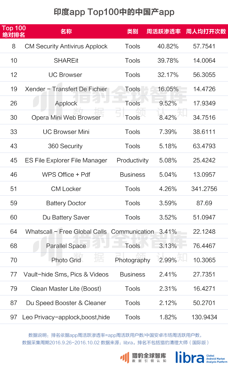 在进入印度市场的中国公司中,移动app发行商的表现优异,打破了之前印度app市场大多由美国公司垄断的局面。这些中国app发行商瞄准了印度的市场空白,抓住了印度网络不好,低端手机多等特点,开发了一些无网络文件传输(如SHAREit)、手机清理加速(如CleanMaster)、快速的手机浏览器(如UC browser)等产品,在印度市场取得了巨大的成功。