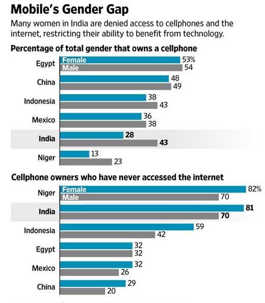 据印度互联网和移动协会数据显示,印度互联网用户中女性用户比例仅为 30% 左右。根据《华尔街日报》搜集的数据,在印度只有28%的女性拥有手机,而在中国这个数字为48%;在手机拥有者中从来没有用手机上过网的女性高达81%,在中国只有29%。