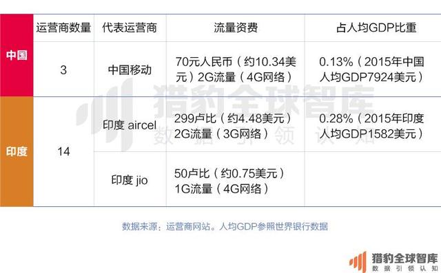 印度政府允许电信业外资控股,因此印度移动通信行业一直处于”小政府”状态,多达14家运营商,且市场份额相对平均,竞争激烈,很多电信运营商都是微利运营。而中国只有三大电信运营商,且都为国资控股,分别为中国移动、中国联通和中国电信,市场被高度垄断。普遍认为,印度的流量资费相对于中国非常便宜,但是,如果从流量资费占人均GDP比例这个角度来看,印度的流量资费还是高于中国。