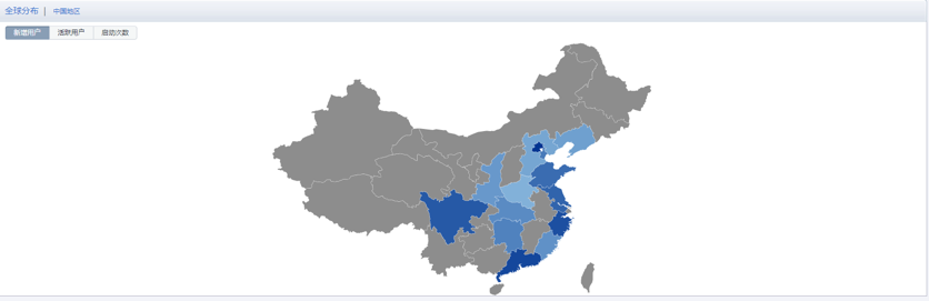 TalkingData App Analytics小程序统计分析针对小程序的“新增用户”、“活跃用户”、“启动次数”三个维度进行地域分析统计。从小程序在微信的定位来看,并不是一个营销的工具,但如果了解小程序的受众人群城市分布,将助推品牌小程序的推广及运营。