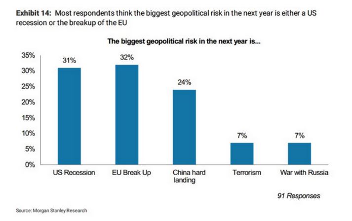 Morgan Stanley :调查显示2017年头号地缘政治风险为欧盟解体 根据摩根士丹利对投资者的调查结果显示,2017年头号地缘政治风险为欧盟解体。 如下图所示,市场对欧盟解体的担忧超过了对美国衰替的担忧,在榜单上跃居首位。 6月份英国脱欧结果以及本周末的意大利关键公投引发市场对欧盟的担忧。据一位经济学家称,选民如投票反对意大利修宪提议,可能会引发欧元区系统性危机。然而《经济学人》杂志认为意大利人应该投投反对票。 除了上述两大风险之外,排在前五位的还有中国经济硬着陆、恐袭与愈发激进的俄罗斯展开战争的风险。 更多阅读:Morgan Stanley:Airbnb给OTA带来的威胁比酒店业更大Morgan Stanley:有线电视用户流失 10% 付费电视订阅者计划今年“掐线”–信息图Morgan Stanley:苹果用户量破5亿 成仅次于FacebookMorgan Stanley:亚洲洞察-加快数字中国进程的五大催化剂 移动互联网部分摘要Morgan Stanley:亚洲洞察-加快数字中国进程的五大催化剂 网络游戏部分摘要Morgan Stanley:2013年9月季iPhone市场需求为3700万Morgan Stanley:调查显示中国用户最高愿意花费4000元购买iPhone 5CMorgan Stanley:44%的iPad用户会减少少量办公用纸大数据:第一部分产业大势–【连载】Crunchbase:2023年Q1网络安全初创公司获得27亿美元投资BackendBenchmarking:2021年第二季度机器人行业报告2015 美国 IPO 展望消费者品牌报告:寻找真相世界品牌实验室:2024年亚洲消费者“国民品牌”忠诚度调查结果 日本、韩国、中国大陆名列前三如何利用社交媒体建立关系网?
