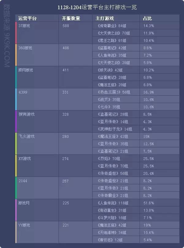 点评:本周各平台主打游戏分布整体变化不大;37游戏本周开服涨幅5%,旗下新游《君王之路》于本周结束测试并后来居上成为主打游戏,其开服频率为9服/天,开服占比10.4%。顺网游戏本周表现同样不俗,开服总数较上周增涨6.7%,新游《修天决》日均开服频率为6服/天是主要影响因素。