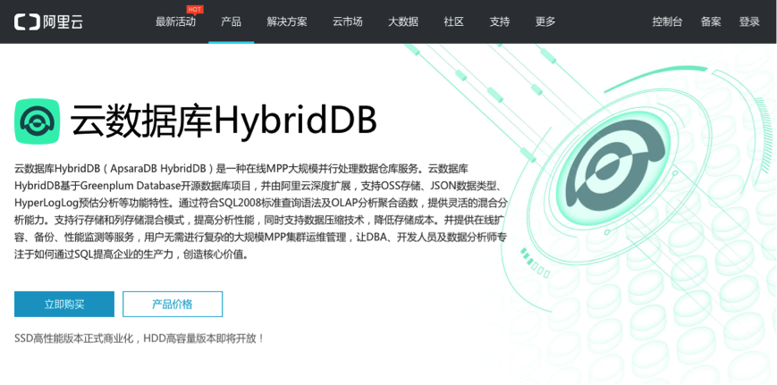 12月9日,阿里云宣布数据库产品 HybridDB 正式商业化。
