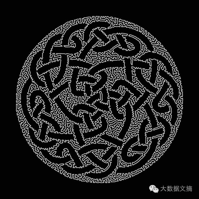 美国数学家Robert Bosch根据5000个城市的旅行商问题的解决方案绘制了这条连续的线。远远地看去,这个印刷物看起来是在一个灰色的背景上秒回了一条黑色的线,构成了一个凯尔特结。但仔细检查后会发现,这个明显的“灰色”实际上是一条移动在黑色背景的顶部的连续白线。白线从不跨越自身 – 它是一个网络而不是一个结 – 所以标题一语双关,答案是“不是”(not)。