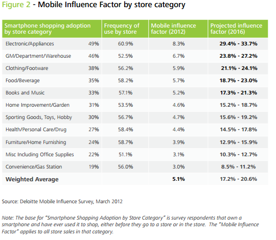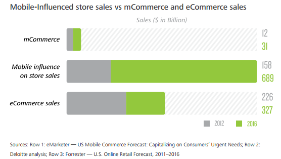 deloitte的调查称2012年智能手机影响5.1%的线下零售商销售相与于1580亿美元,2016年,这个数字将会翻三倍,增长至6890亿美元。