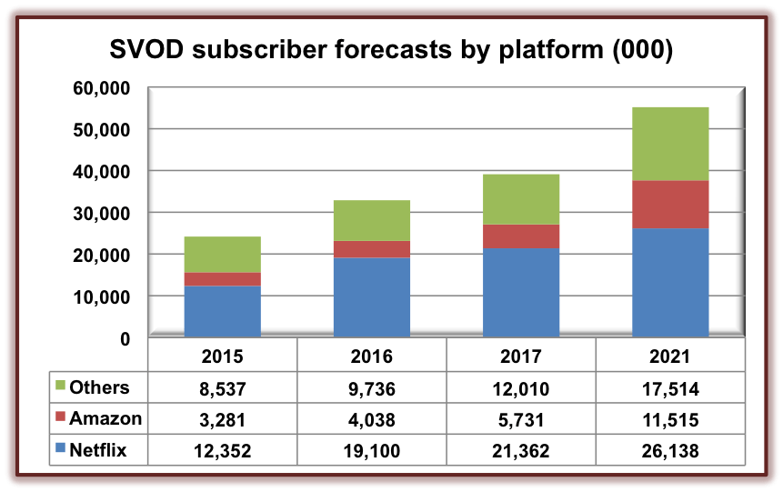 2015年Netflix订户在西欧SVOD市场的份额为51%,预计2021年将降至47%。但Amazon的份额同期将由14%增至21%。届时这两家公司将垄断西欧三分之二的SVOD订户。