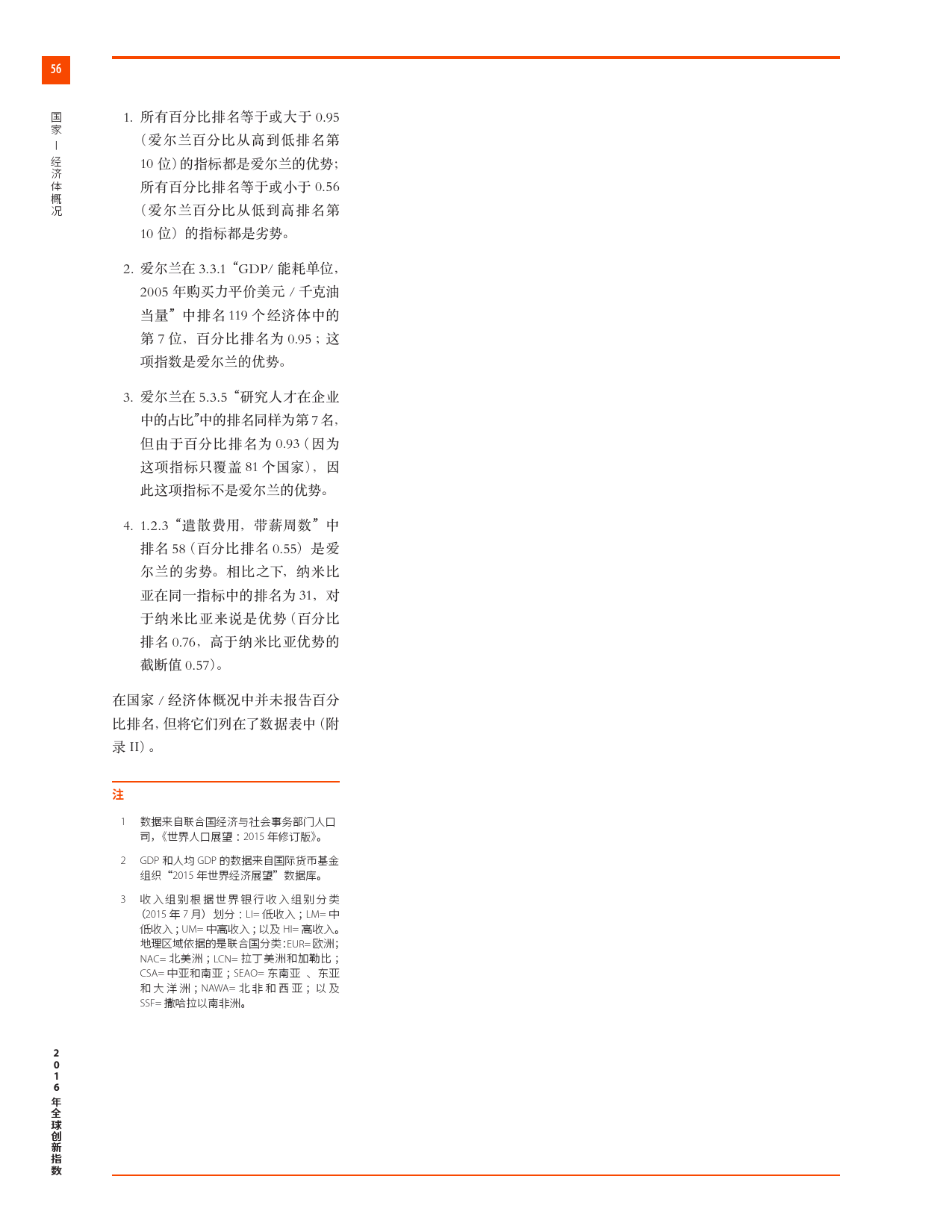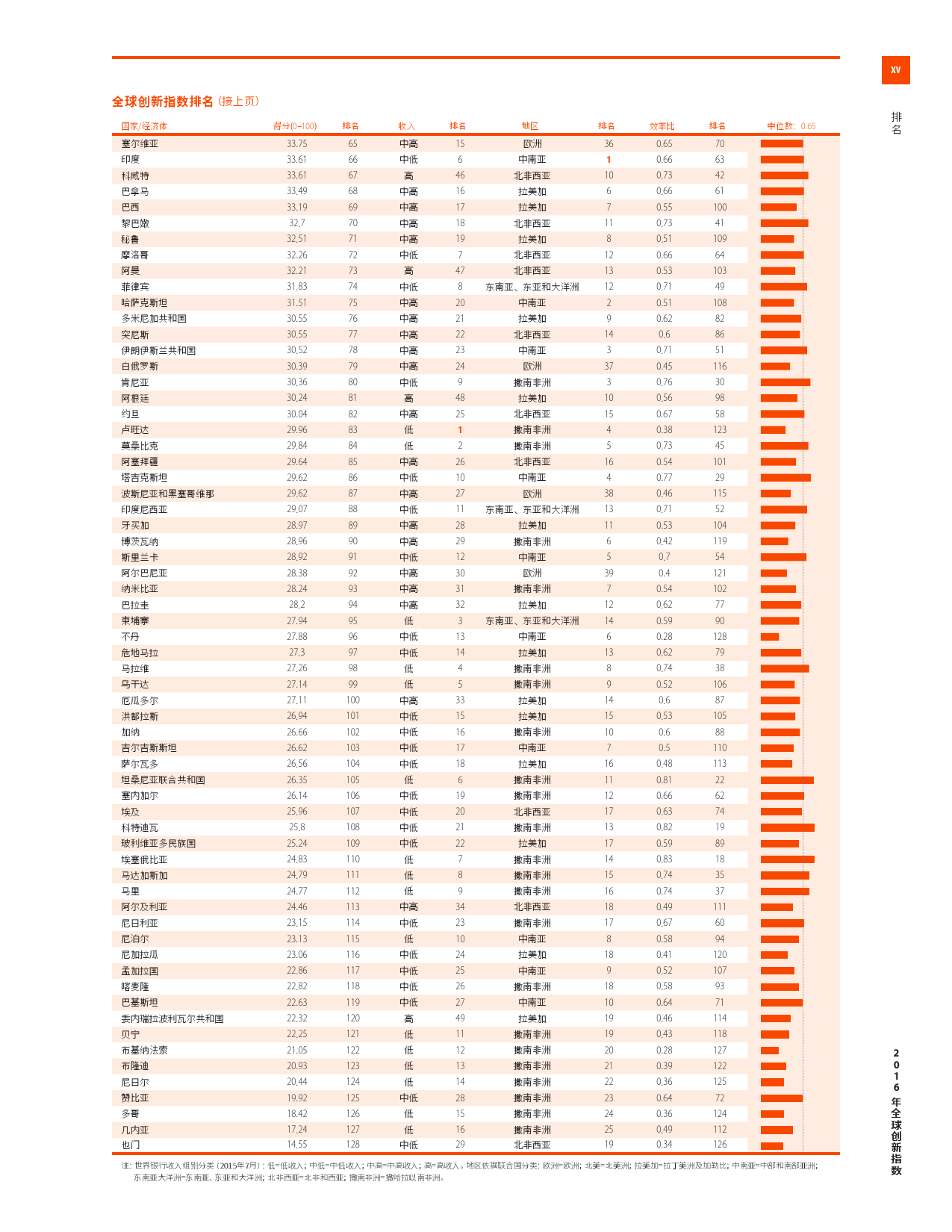 在82项具体评估指标中,中国在高科技出口比例、知识型员工、15岁青少年能力(阅读、数学与科学)评估、公司培训等10项指标中全球居首;在全球性公司研发投入、知识与技术产出、无形资产等方面优势显著。不过,中国在监管环境、高等教育、单位能源产生的GDP贡献量等指标中排名靠后。