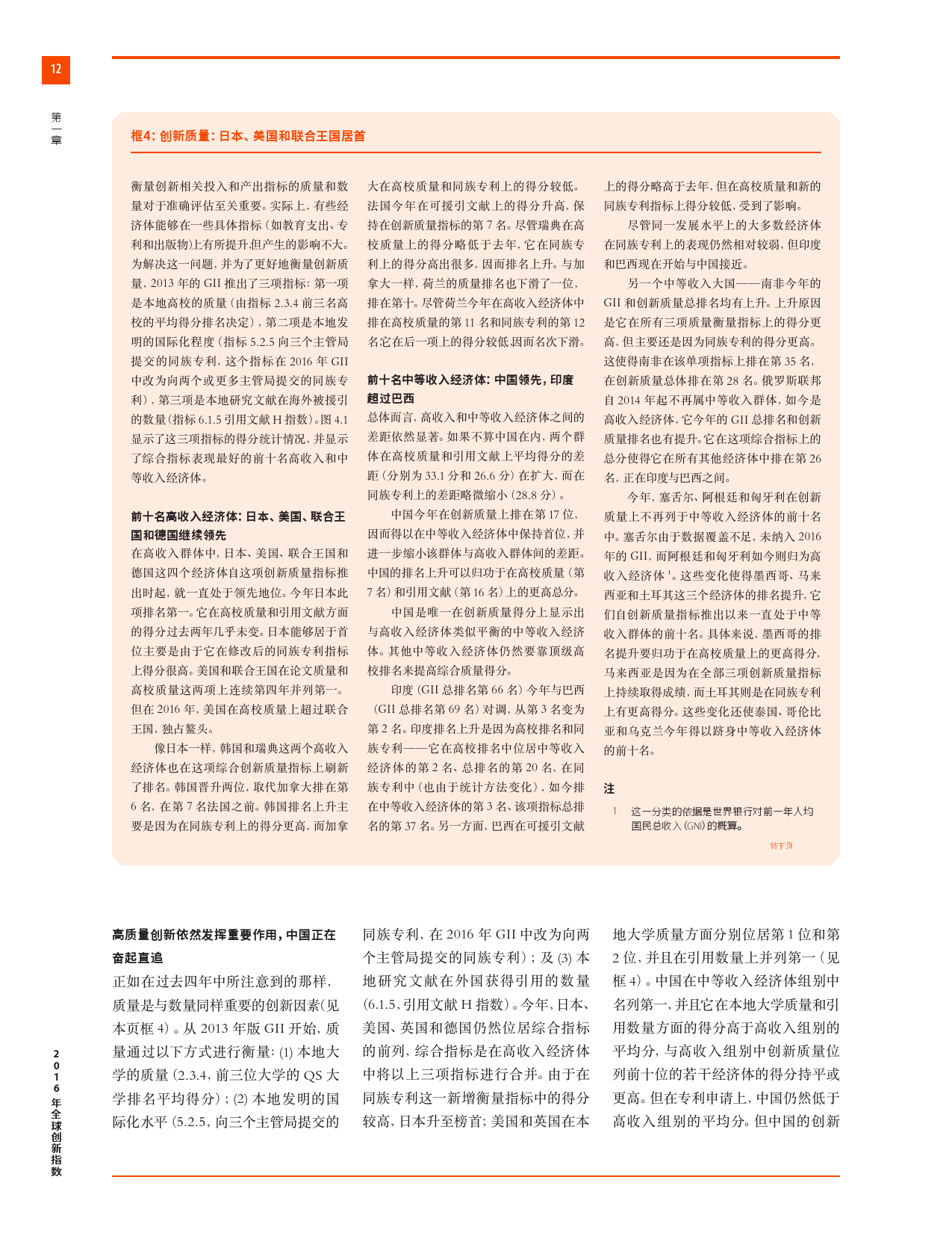 在评估高校水平、科学出版物和国际专利申请量的顶层指标“创新质量”中,日本、美国、英国和德国排名前四,中国名列第17位,成为中等收入经济体的领头羊,其次是印度(25位)和巴西(27位)。