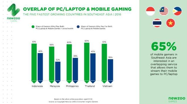 据统计,东南亚PC、手游跨屏趋势增长最快的国家分别为:印度尼西亚,菲律宾,越南,泰国和马来西亚。65%的东南亚移动运营商表示,他们对提供使用电脑玩手游的服务感兴趣。